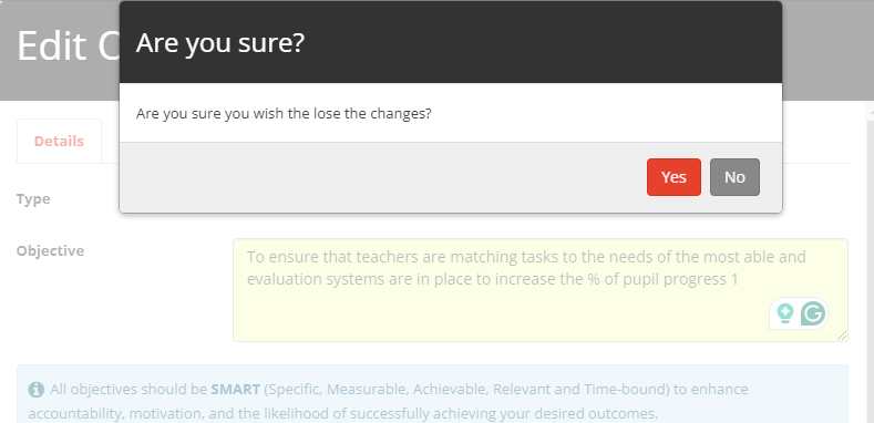 Selecting Close on the Objective screen will now ask the user to confirm the action if the system detects a change to the data to prevent the data from being lost by accident.