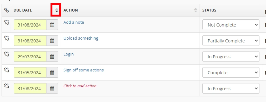 The system will now allow you to order the Objective Action by the due date in the staff members' portfolio using the ordering arrows at the top of the due date column.