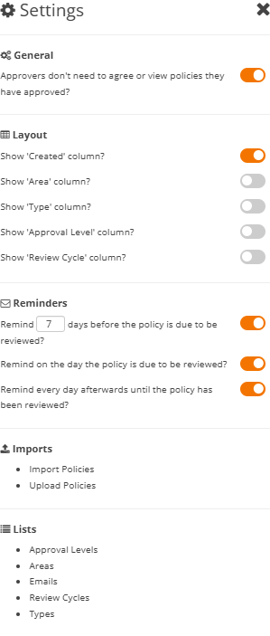 Click the cog icon will now display all the setting for the policies in a side panel rather than having to navigate to the settings section of the system.
