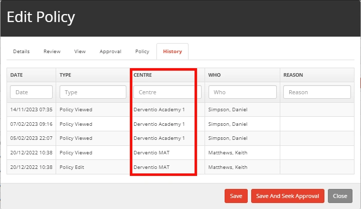 At the Trust level when viewing the Policies history tab it now shows the centre where the user has acted on that policy.