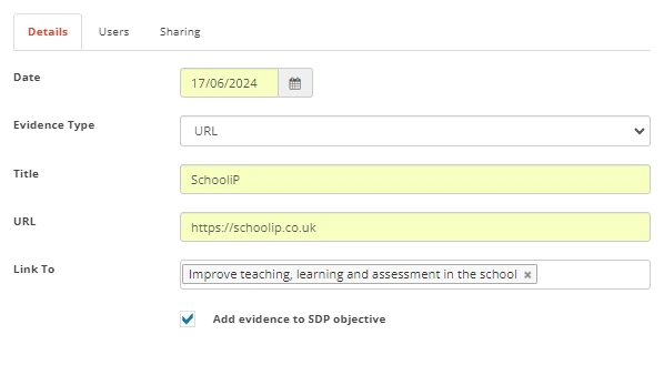 When a staff objective is linked to an SDP Objective the user will get the option to link the evidence to the SDP objective by ticking the 'Add evidence to SDP Objective' checkbox.