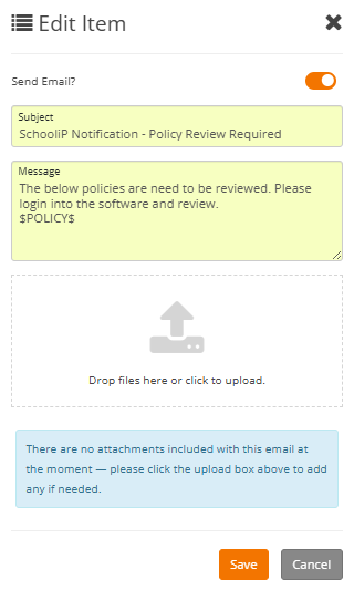 Once you select the edit pencil next to the email you want to modify you will get the following options to turn the emails on or off as well as being able to modify the text and add documents